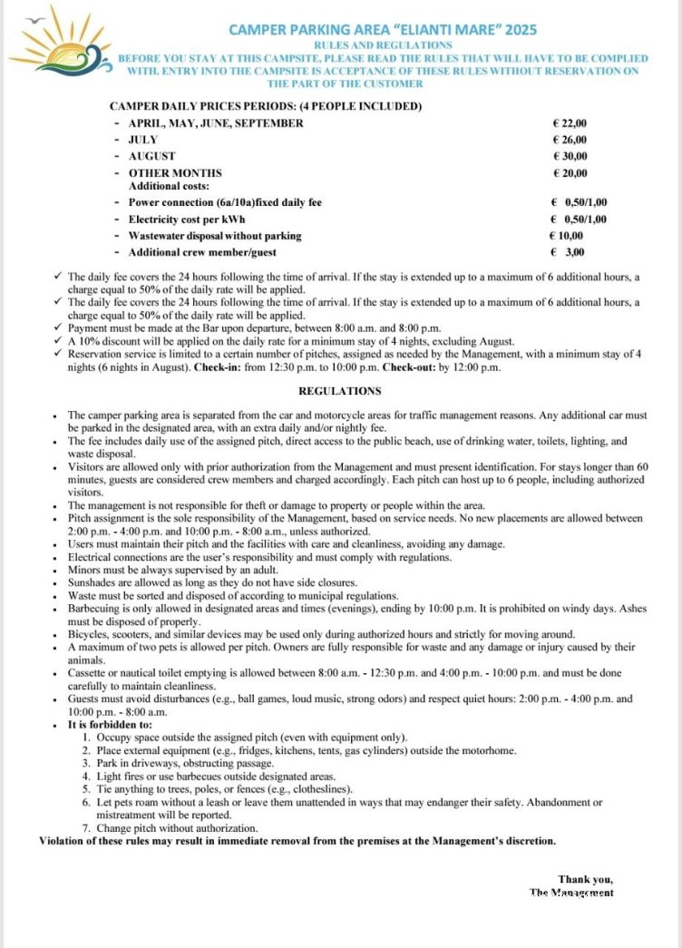 Open from April, price increases as it nears summer (reaching €22 in August) we paid €15 for 24 hours plus €3 for electric in May. Absolutely beautiful spot parked up in an olive grove with the gate at the front leading directly onto the beach. Owner super friendly. The place is called Elianti Mare & was easy to get to in our 7.5 metre motorhome. Highly recommend!