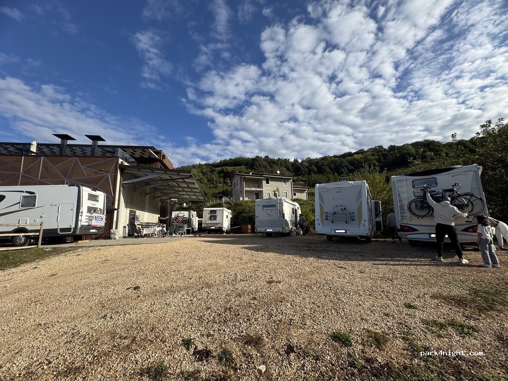 A nice stop among the nature with great view and winery. Recommend the guests to try the wines and visit the winery, the people were very polite. Also there is clean toilet and shower. If you buy 6 wines, you don't pay for the night. In the town there is nice authrntic pizza place - Blue Star. Close to the autostrada snd Soave (which is beautiful small town).