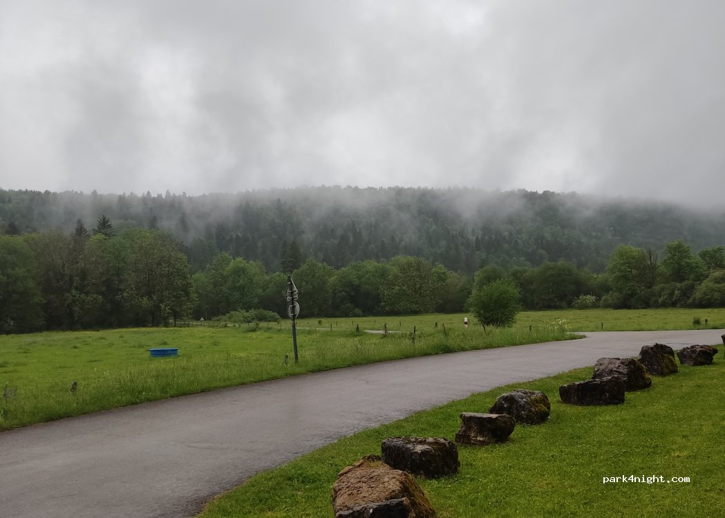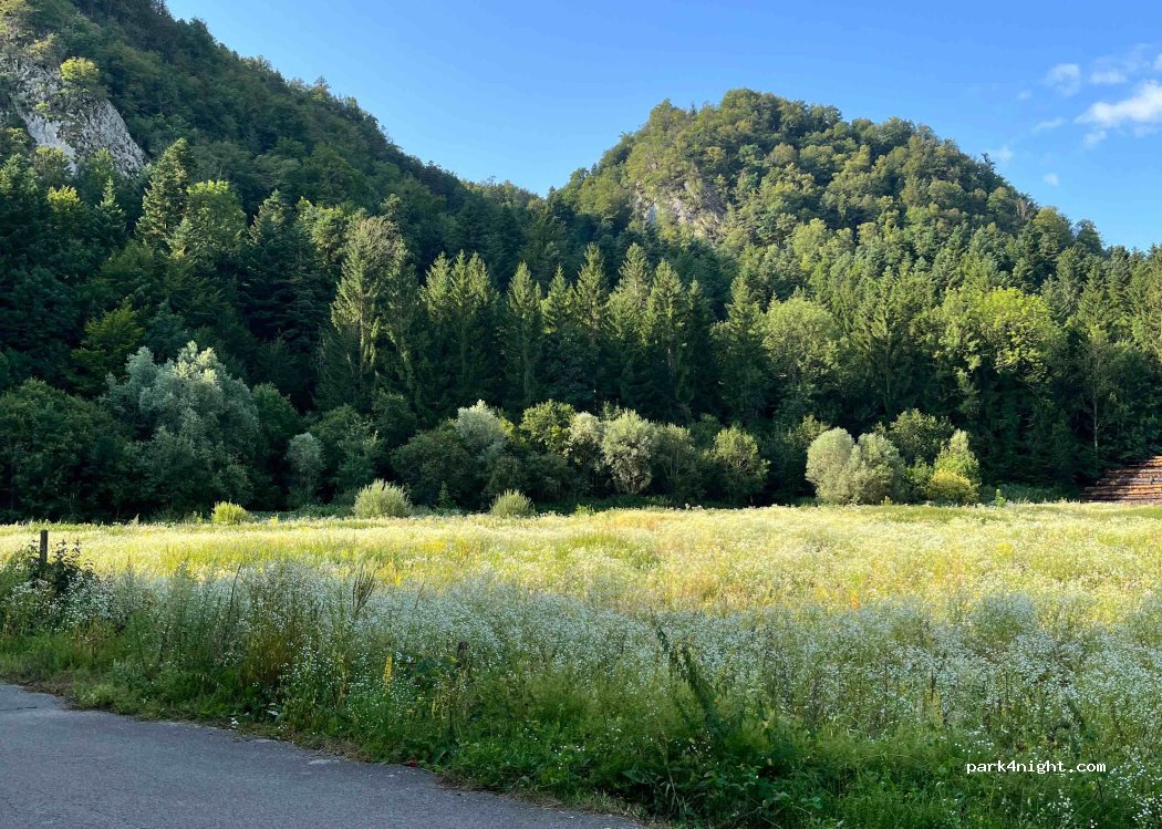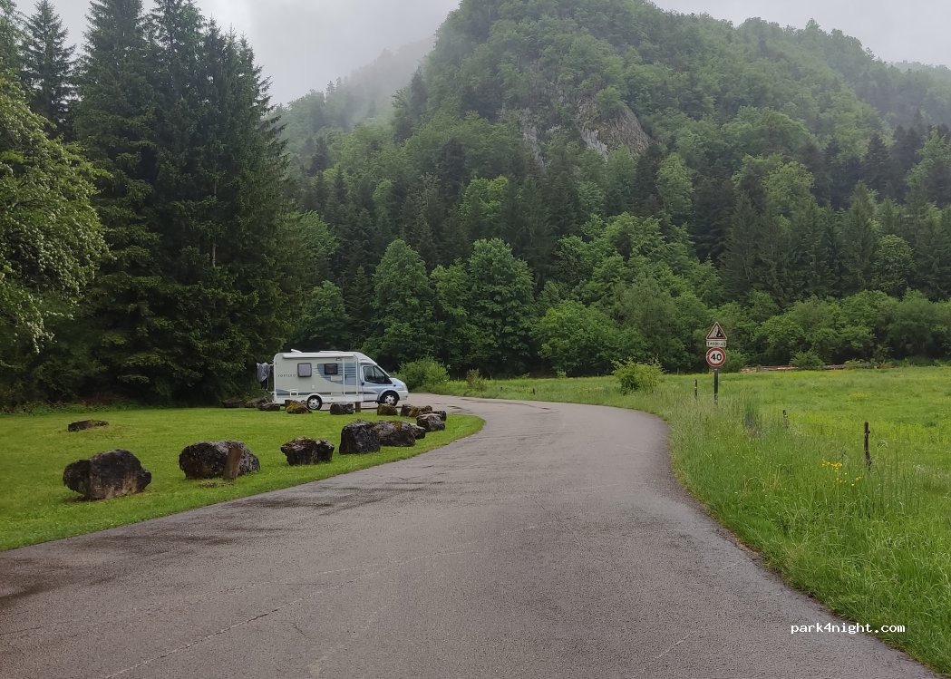 Emplacement goudronné, avec table de pique nique sur l’herbe. Très agréable, nuit au calme avec le bruit de l’eau (l’Ain) au loin. Poubelle à proximité. Route à côté très peu empruntée, je recommande