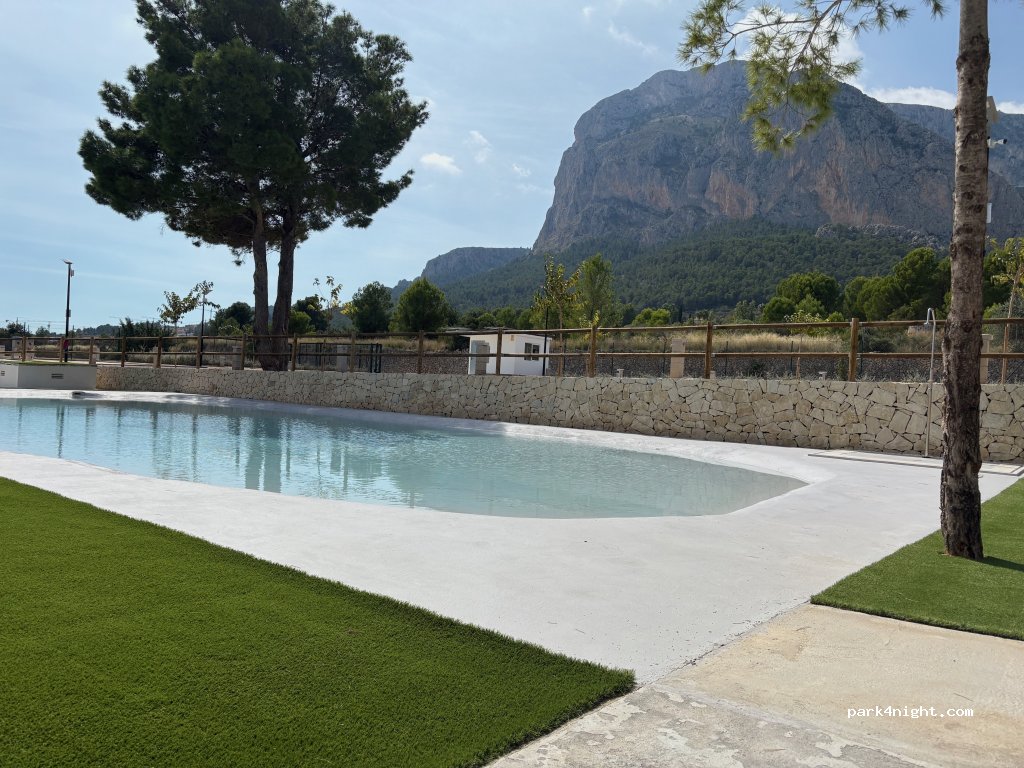 Afgesloten terrein door hek met toegangscode en loopdeur. onderaan de bergen waar gewandeld kan worden en er waren ook mensen aan het klimmen. En uitzicht op het dorp Polop en zee in de verte bij Altea en L' Albir. Hij was net een paar dagen geopend, dat we kwamen. 3 fijne nachten gestaan en met de motor rondrit gemaakt naar Guadalest en stuwmeer. een aanrader.
