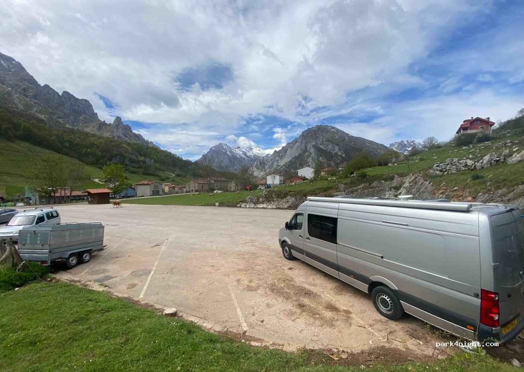 It’s amazing that overnight stay is tolerated here - lovely village with lots of bars, beautiful mountain views and lots to do. Bus down the valley to access Poncebos (Ruta del Cares, Bulnes). VERY BUSY during our stay and a good amount of spots are at an angle. Please don’t leave any trace, especially no trash or toilet paper (or worse).